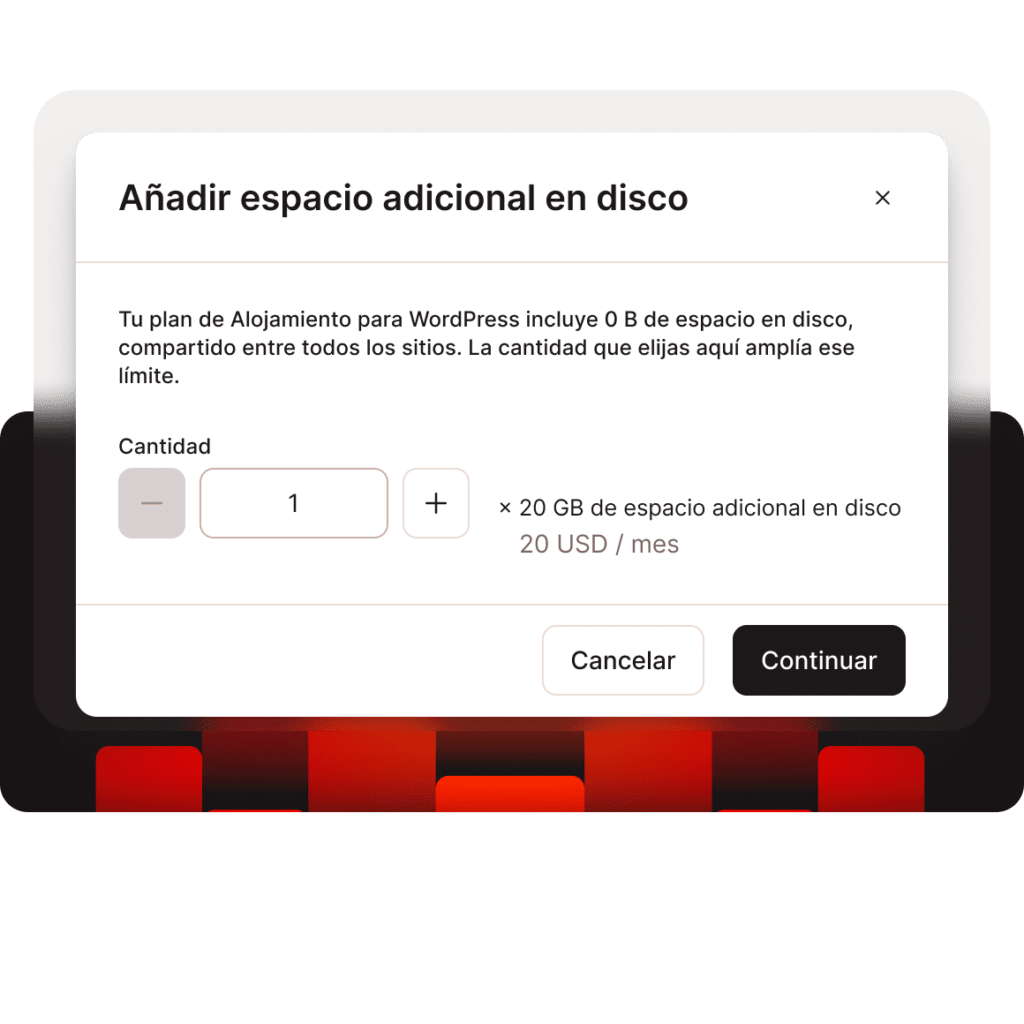 Para sitios grandes con muchos archivos o imágenes, nuestro add-on mensual aumentará el espacio en disco de tu plan.