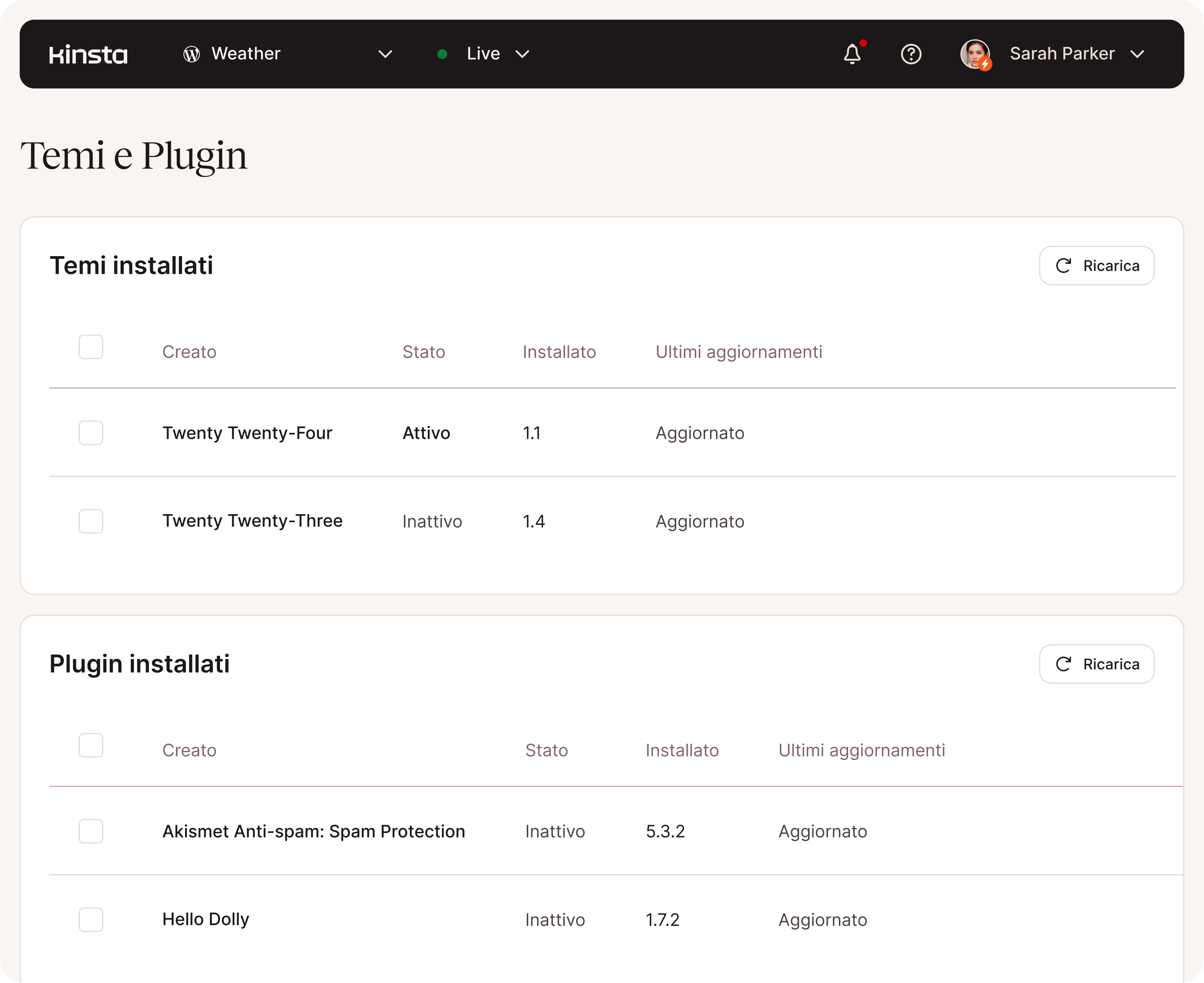 - Aggiornamento di plugin/temi direttamente da MyKinsta