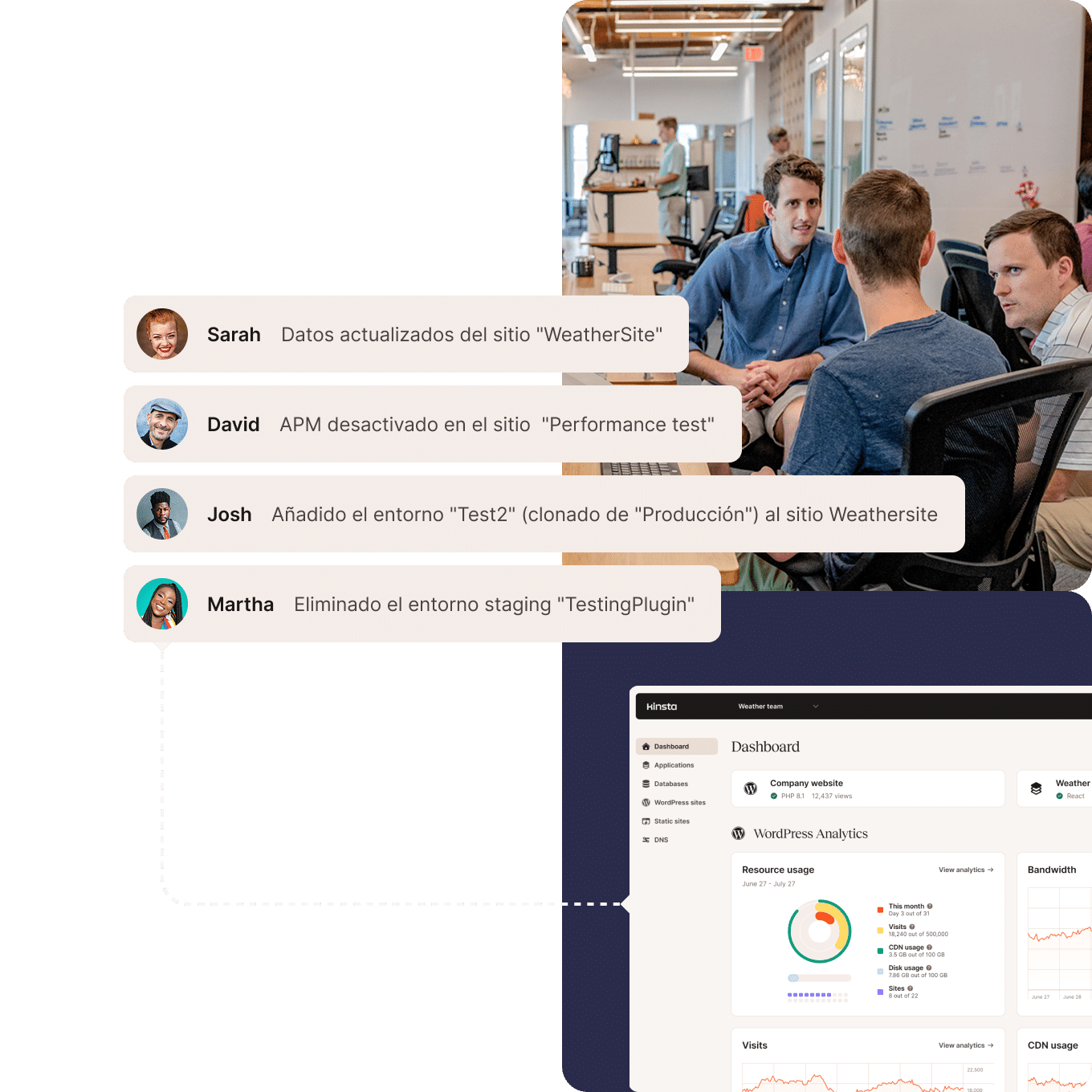 Reduce el tiempo dedicado al mantenimiento y la gestión y céntrate en desarrollar nuevas experiencias para tus clientes con nuestros sistemas automatizados. De forma sencilla y eficiente, puedes gestionar y transferir sitios web, optimizando el flujo de trabajo de tu agencia. Migra gratis todos los sitios web de tus clientes y trabaja fácilmente con colaboradores, gestionando permisos de acceso para cada proyecto. Además, nuestro equipo de expertos en migración de WordPress se encargará de todo el trabajo pesado. ¡Descubre cómo nuestro Alojamiento de WordPress para agencias puede ahorrarte tiempo y dinero!
