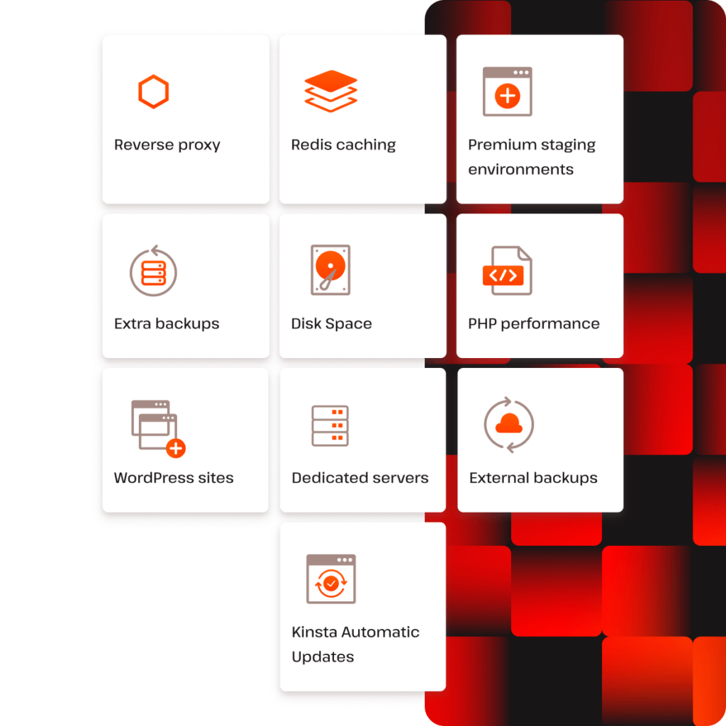 A selection of premium add-ons that can help you take your site to the next level. They can all be accessed right from the MyKinsta dashboard.